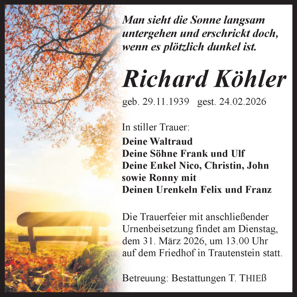 Hier finden Sie alle Traueranzeigen aus der Zeitung, die bisher für Richard Köhler erschienen sind. Weitere Traueranzeigen, die in der Zeitung erscheinen, werden hier ebenfalls aufgelistet