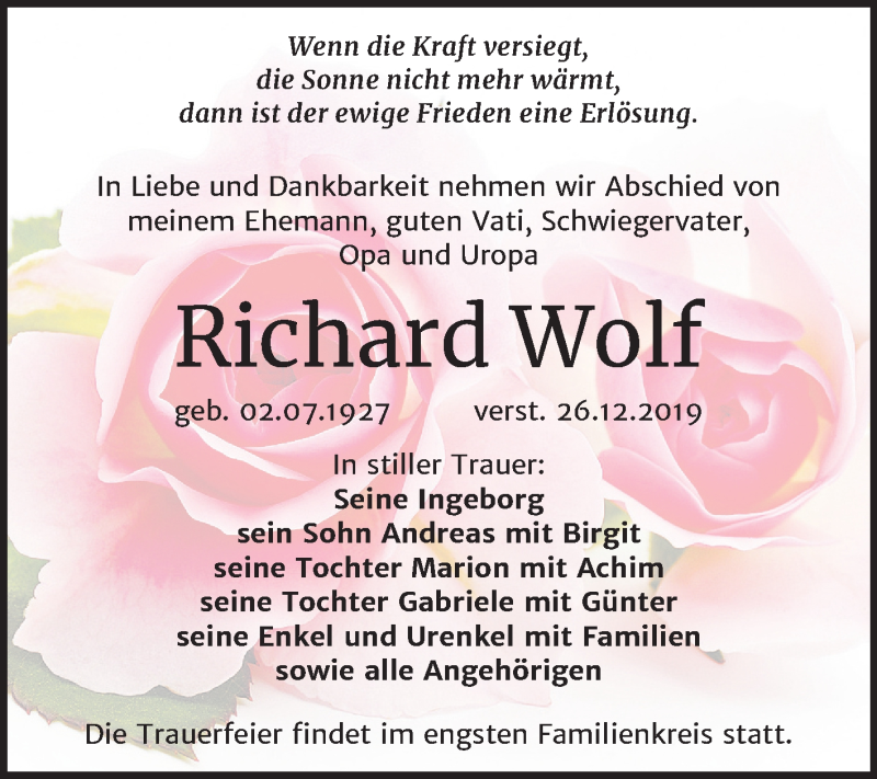 Hier finden Sie alle Traueranzeigen aus der Zeitung, die bisher für Richard Wolf erschienen sind. Weitere Traueranzeigen, die in der Zeitung erscheinen, werden hier ebenfalls aufgelistet