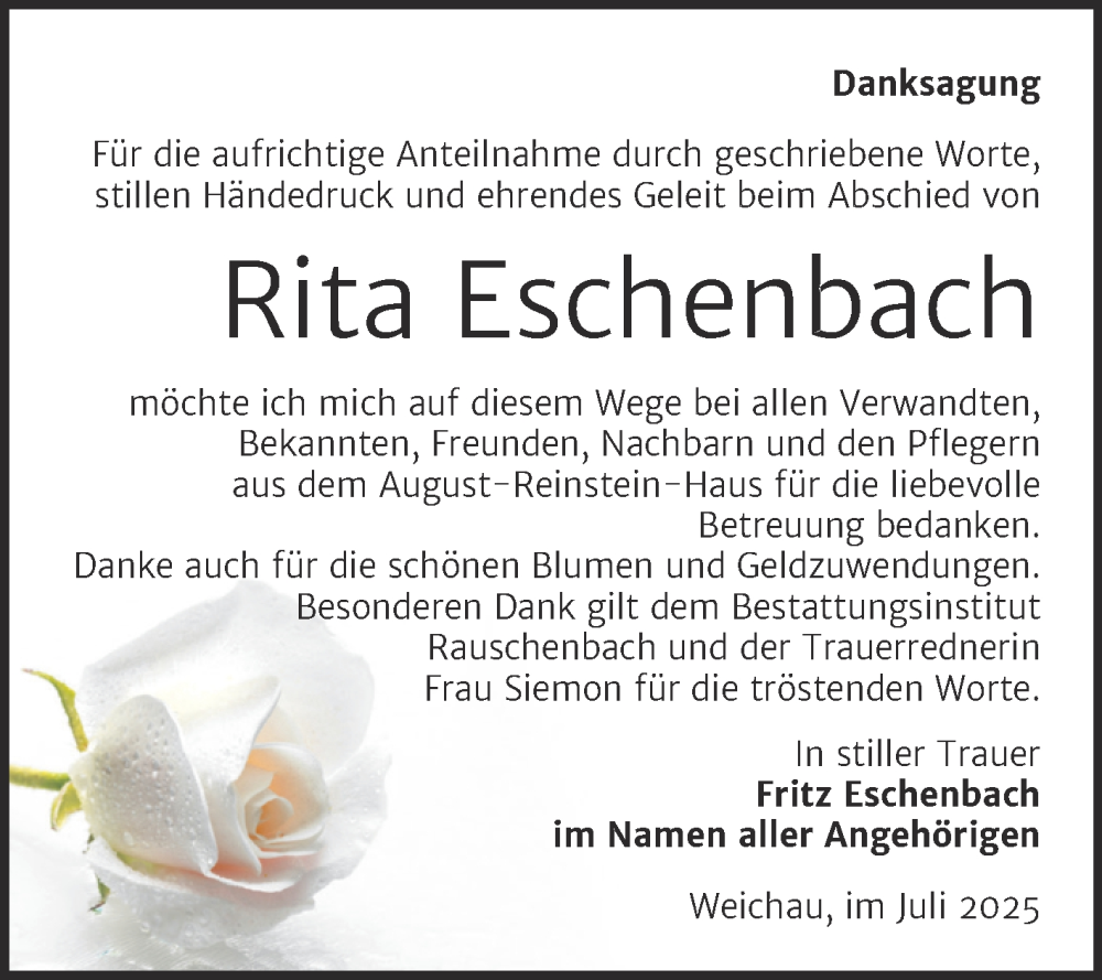 Hier finden Sie alle Traueranzeigen aus der Zeitung, die bisher für Rita Eschenbach erschienen sind. Weitere Traueranzeigen, die in der Zeitung erscheinen, werden hier ebenfalls aufgelistet