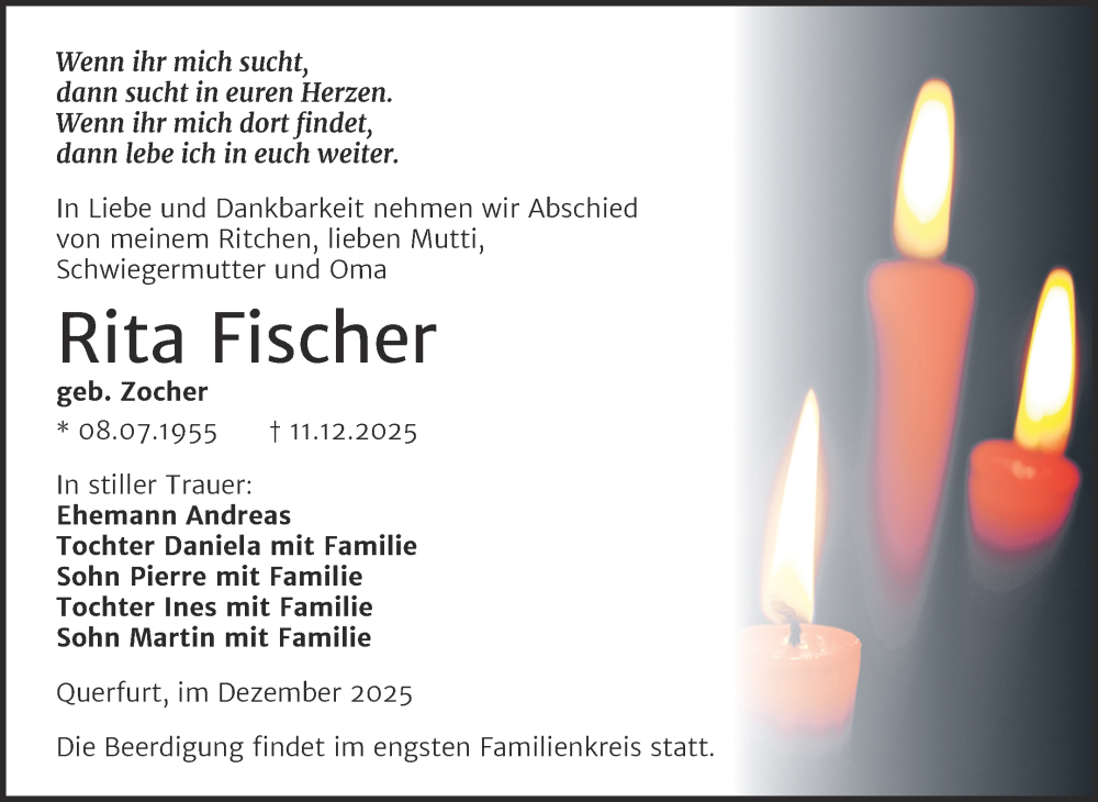 Hier finden Sie alle Traueranzeigen aus der Zeitung, die bisher für Rita Fischer erschienen sind. Weitere Traueranzeigen, die in der Zeitung erscheinen, werden hier ebenfalls aufgelistet
