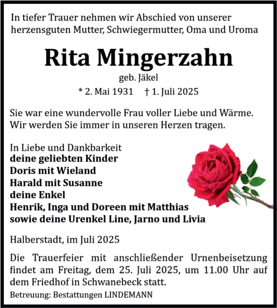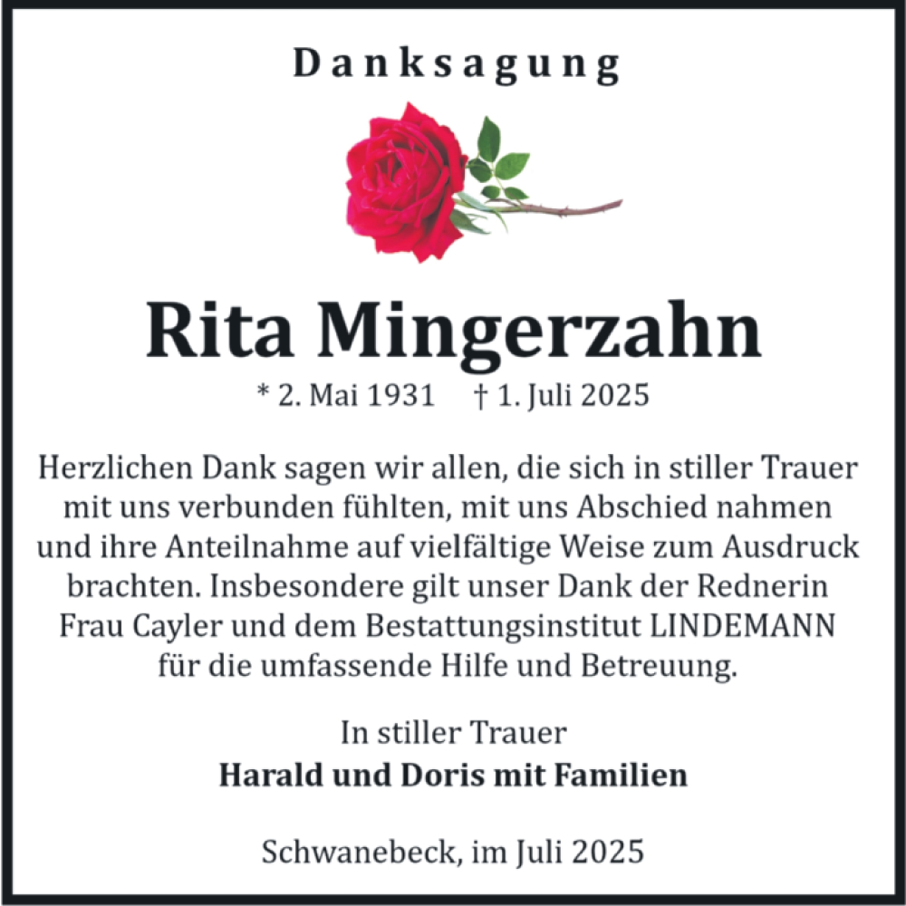 Hier finden Sie alle Traueranzeigen aus der Zeitung, die bisher für Rita Mingerzahn erschienen sind. Weitere Traueranzeigen, die in der Zeitung erscheinen, werden hier ebenfalls aufgelistet