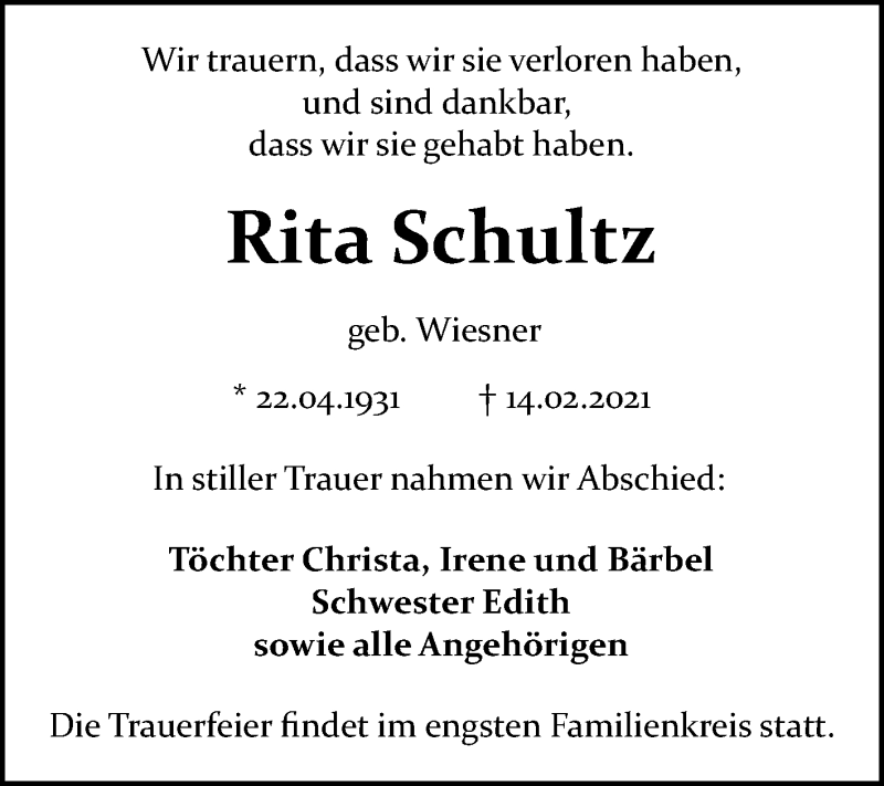 Hier finden Sie alle Traueranzeigen aus der Zeitung, die bisher für Rita Schultz erschienen sind. Weitere Traueranzeigen, die in der Zeitung erscheinen, werden hier ebenfalls aufgelistet