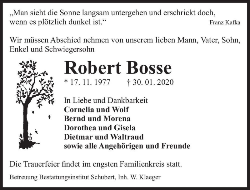 Hier finden Sie alle Traueranzeigen aus der Zeitung, die bisher für Robert Bosse erschienen sind. Weitere Traueranzeigen, die in der Zeitung erscheinen, werden hier ebenfalls aufgelistet