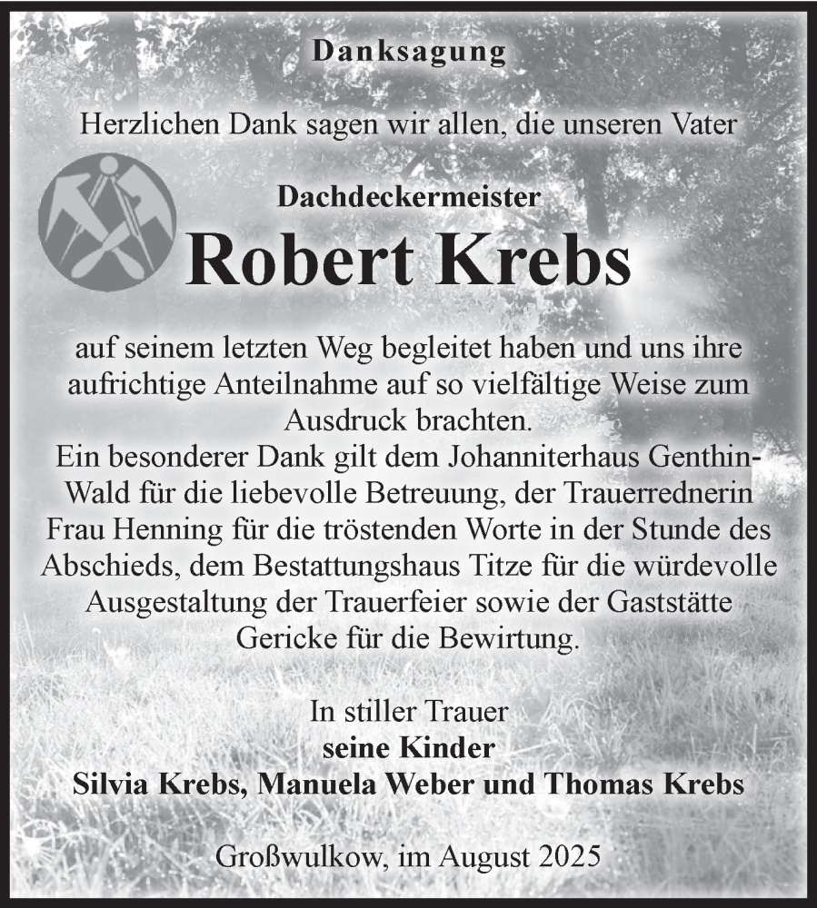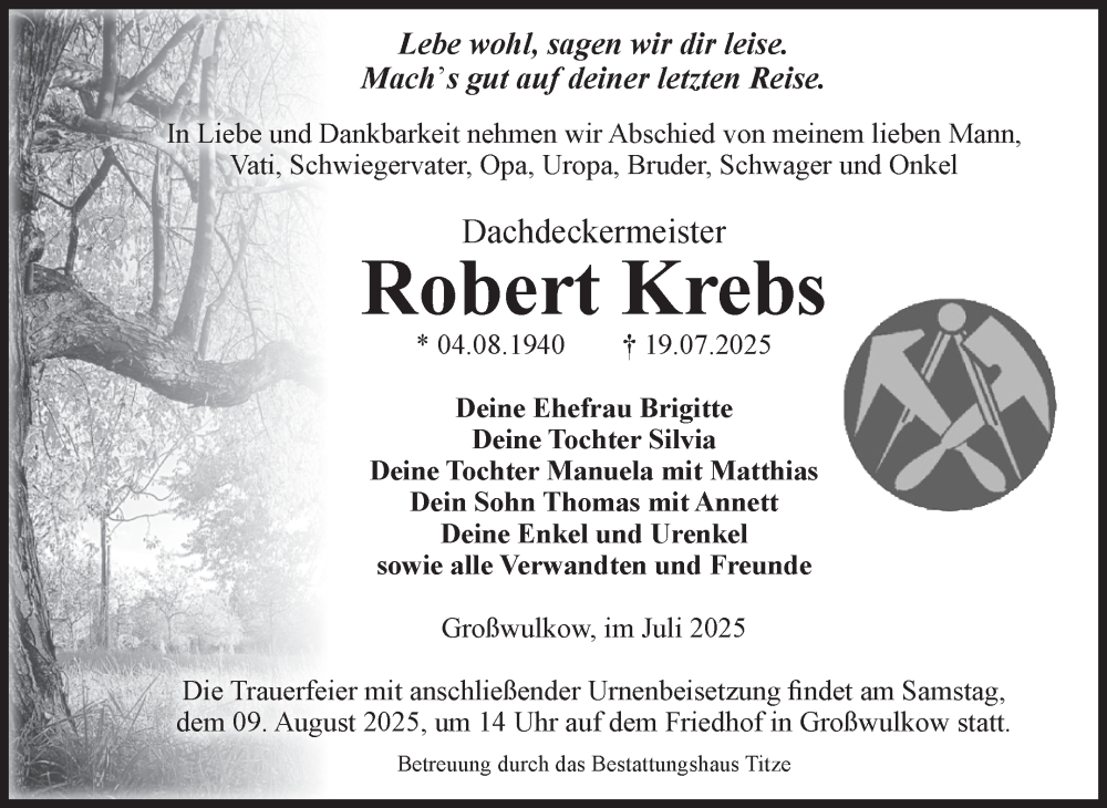 Hier finden Sie alle Traueranzeigen aus der Zeitung, die bisher für Robert Krebs erschienen sind. Weitere Traueranzeigen, die in der Zeitung erscheinen, werden hier ebenfalls aufgelistet