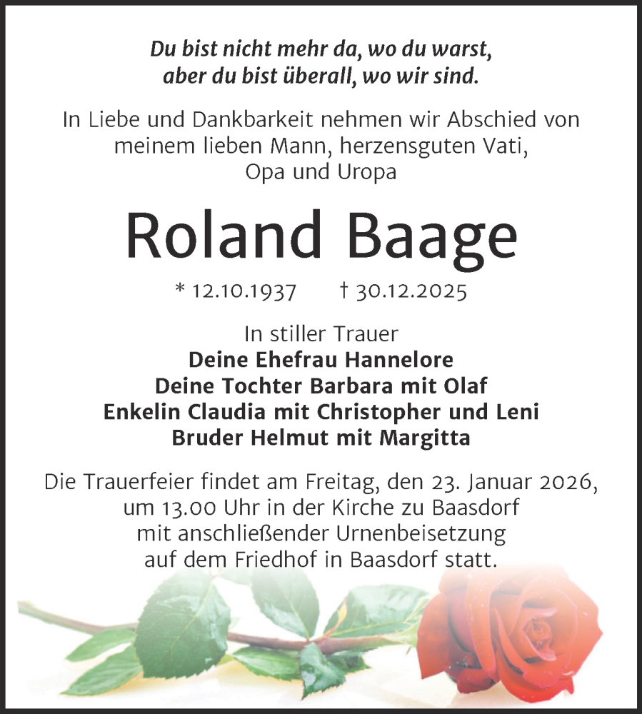 Hier finden Sie alle Traueranzeigen aus der Zeitung, die bisher für Roland Baage erschienen sind. Weitere Traueranzeigen, die in der Zeitung erscheinen, werden hier ebenfalls aufgelistet