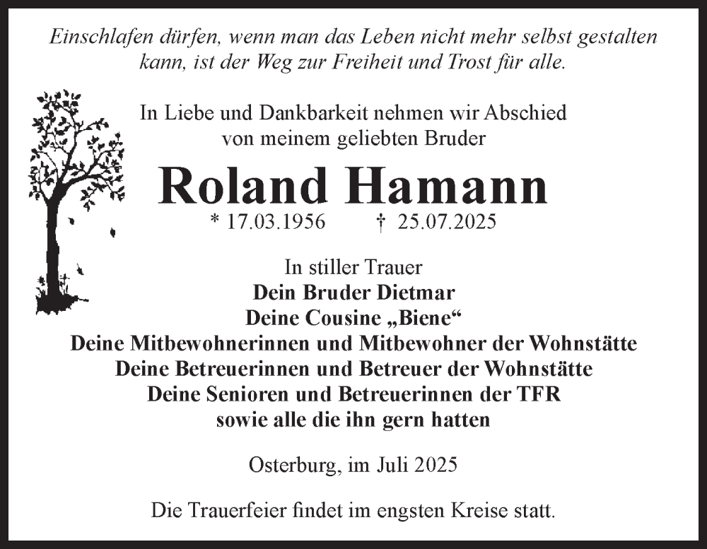Hier finden Sie alle Traueranzeigen aus der Zeitung, die bisher für Roland Hamann erschienen sind. Weitere Traueranzeigen, die in der Zeitung erscheinen, werden hier ebenfalls aufgelistet