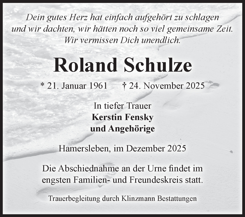 Hier finden Sie alle Traueranzeigen aus der Zeitung, die bisher für Roland Schulze erschienen sind. Weitere Traueranzeigen, die in der Zeitung erscheinen, werden hier ebenfalls aufgelistet