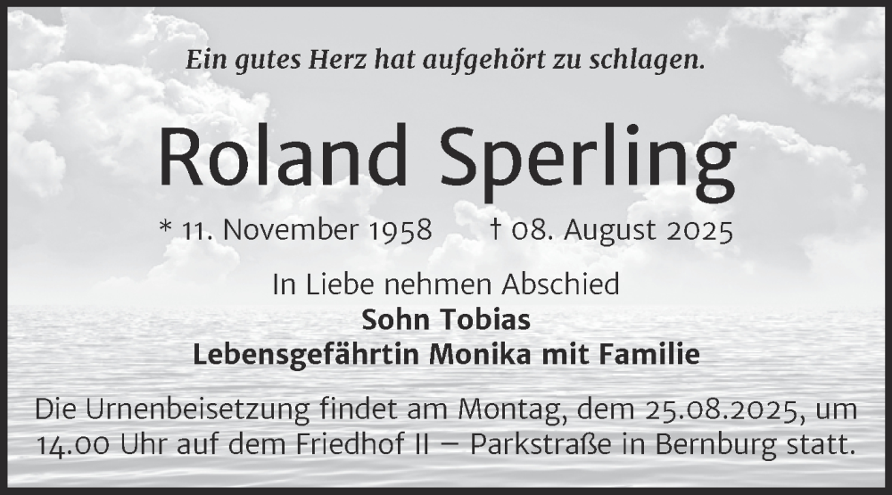 Hier finden Sie alle Traueranzeigen aus der Zeitung, die bisher für Roland Sperling erschienen sind. Weitere Traueranzeigen, die in der Zeitung erscheinen, werden hier ebenfalls aufgelistet