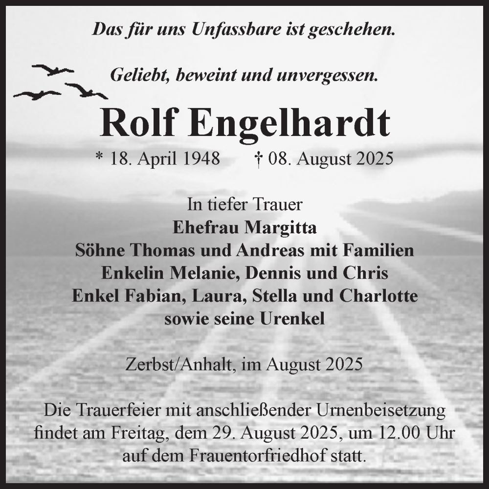 Hier finden Sie alle Traueranzeigen aus der Zeitung, die bisher für Rolf Engelhardt erschienen sind. Weitere Traueranzeigen, die in der Zeitung erscheinen, werden hier ebenfalls aufgelistet