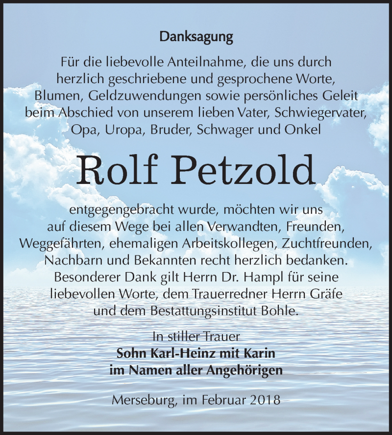 Hier finden Sie alle Traueranzeigen aus der Zeitung, die bisher für Rolf Petzold erschienen sind. Weitere Traueranzeigen, die in der Zeitung erscheinen, werden hier ebenfalls aufgelistet
