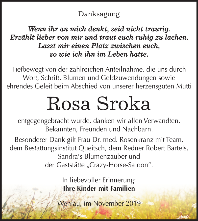 Hier finden Sie alle Traueranzeigen aus der Zeitung, die bisher für Rosa Sroka erschienen sind. Weitere Traueranzeigen, die in der Zeitung erscheinen, werden hier ebenfalls aufgelistet