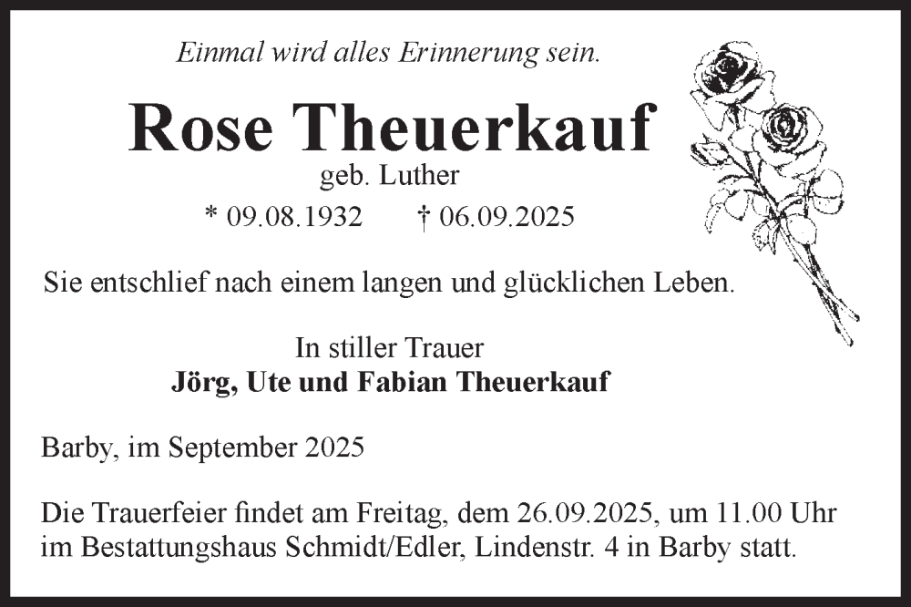 Hier finden Sie alle Traueranzeigen aus der Zeitung, die bisher für Rose Theuerkauf erschienen sind. Weitere Traueranzeigen, die in der Zeitung erscheinen, werden hier ebenfalls aufgelistet