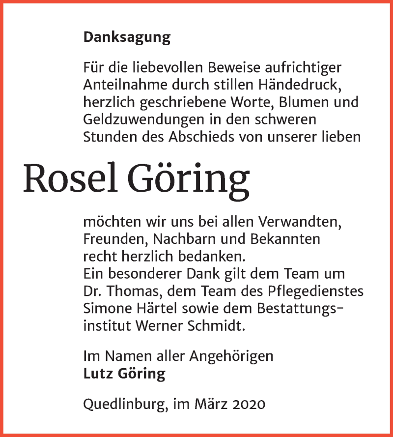 Hier finden Sie alle Traueranzeigen aus der Zeitung, die bisher für Rosel Göring erschienen sind. Weitere Traueranzeigen, die in der Zeitung erscheinen, werden hier ebenfalls aufgelistet