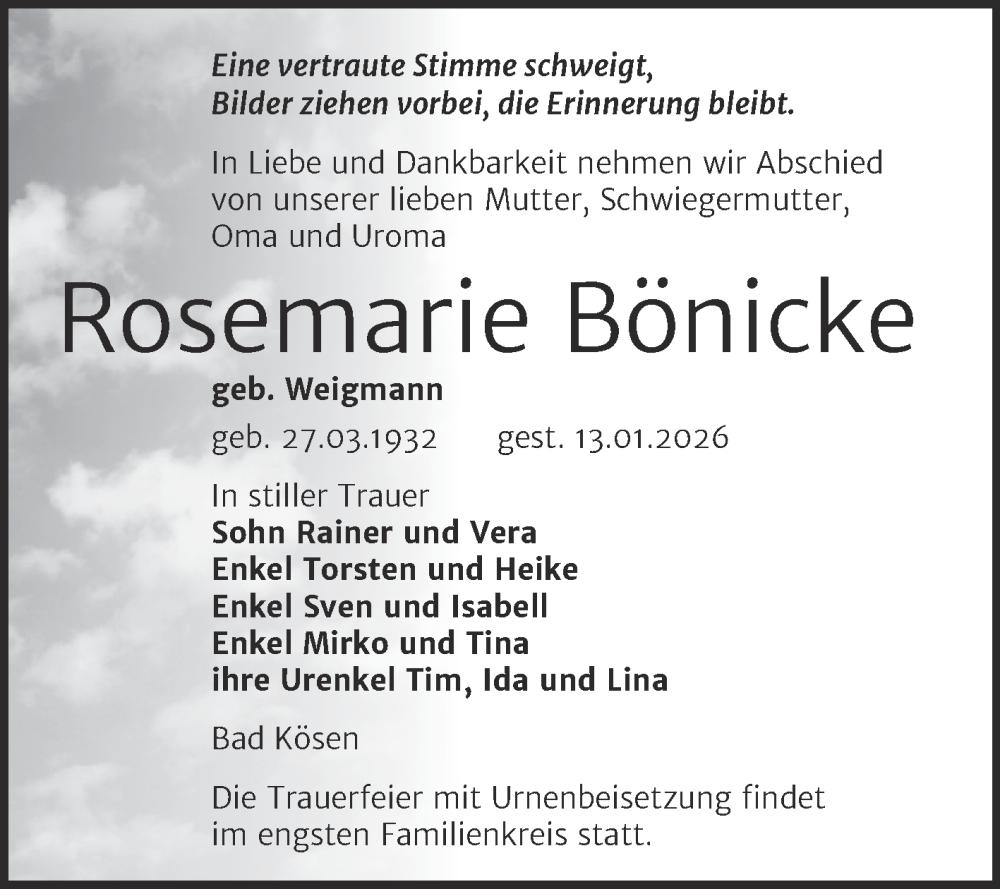 Hier finden Sie alle Traueranzeigen aus der Zeitung, die bisher für Rosemarie Bönicke erschienen sind. Weitere Traueranzeigen, die in der Zeitung erscheinen, werden hier ebenfalls aufgelistet