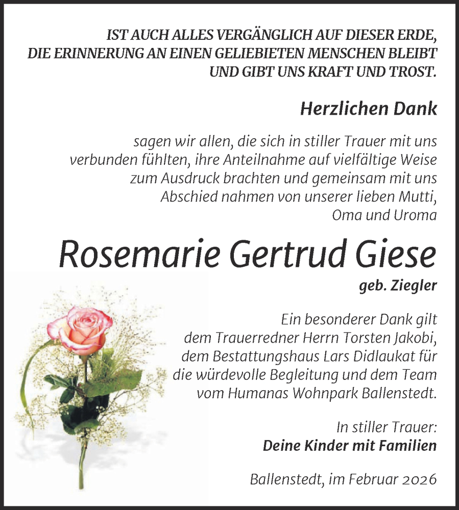 Hier finden Sie alle Traueranzeigen aus der Zeitung, die bisher für Rosemarie Gertrud Giese erschienen sind. Weitere Traueranzeigen, die in der Zeitung erscheinen, werden hier ebenfalls aufgelistet