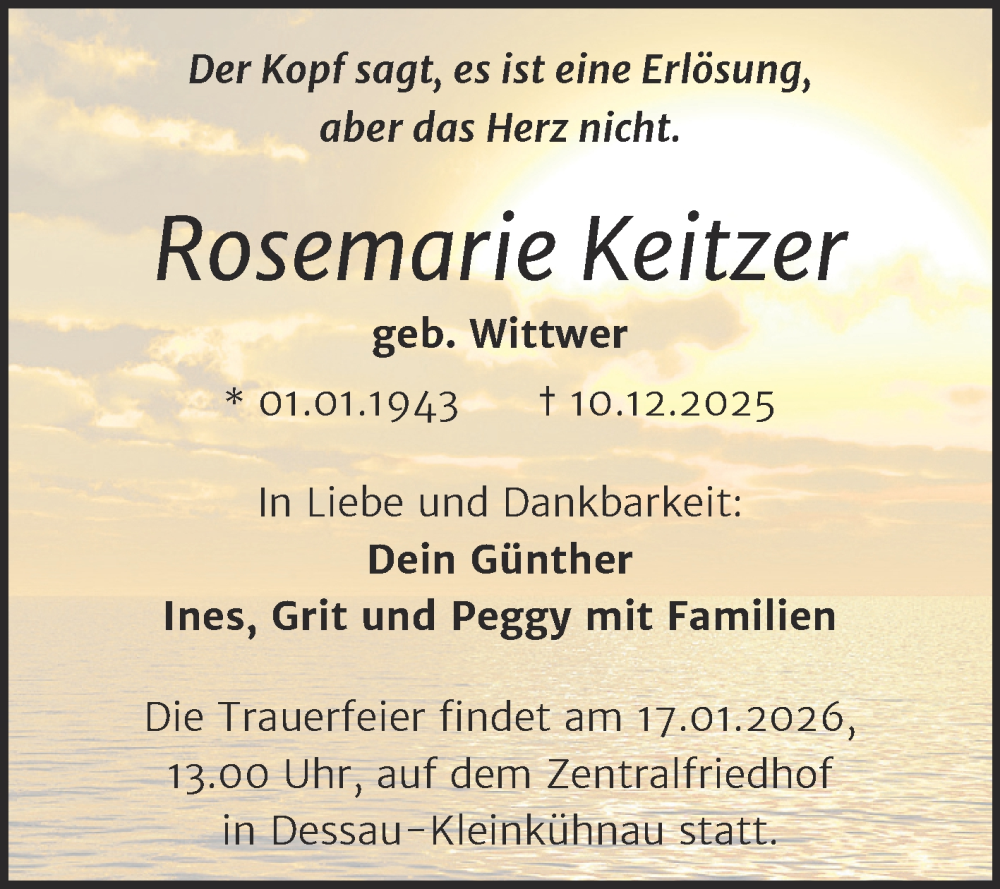 Hier finden Sie alle Traueranzeigen aus der Zeitung, die bisher für Rosemarie Keitzer erschienen sind. Weitere Traueranzeigen, die in der Zeitung erscheinen, werden hier ebenfalls aufgelistet