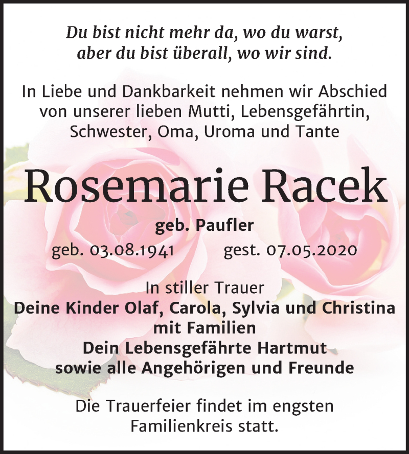 Hier finden Sie alle Traueranzeigen aus der Zeitung, die bisher für Rosemarie Racek erschienen sind. Weitere Traueranzeigen, die in der Zeitung erscheinen, werden hier ebenfalls aufgelistet