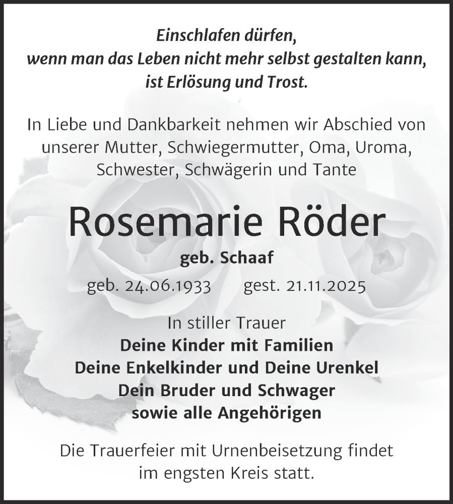 Hier finden Sie alle Traueranzeigen aus der Zeitung, die bisher für Rosemarie Röder erschienen sind. Weitere Traueranzeigen, die in der Zeitung erscheinen, werden hier ebenfalls aufgelistet
