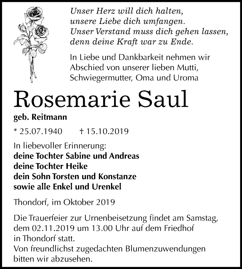 Hier finden Sie alle Traueranzeigen aus der Zeitung, die bisher für Rosemarie Saul erschienen sind. Weitere Traueranzeigen, die in der Zeitung erscheinen, werden hier ebenfalls aufgelistet