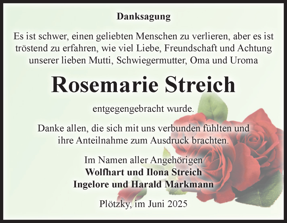 Hier finden Sie alle Traueranzeigen aus der Zeitung, die bisher für Rosemarie Streich erschienen sind. Weitere Traueranzeigen, die in der Zeitung erscheinen, werden hier ebenfalls aufgelistet