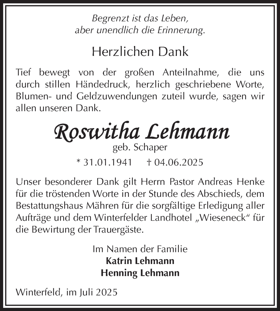 Hier finden Sie alle Traueranzeigen aus der Zeitung, die bisher für Roswitha Lehmann erschienen sind. Weitere Traueranzeigen, die in der Zeitung erscheinen, werden hier ebenfalls aufgelistet
