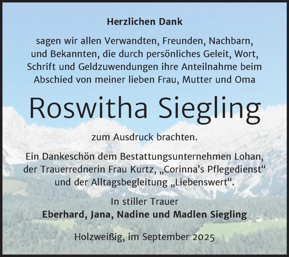 Hier finden Sie alle Traueranzeigen aus der Zeitung, die bisher für Roswitha Siegling erschienen sind. Weitere Traueranzeigen, die in der Zeitung erscheinen, werden hier ebenfalls aufgelistet