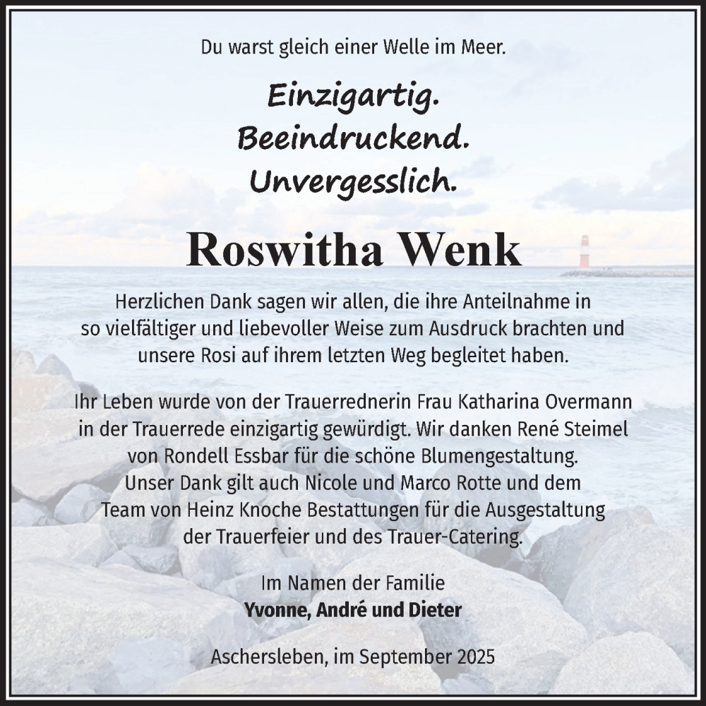 Hier finden Sie alle Traueranzeigen aus der Zeitung, die bisher für Roswitha Wenk erschienen sind. Weitere Traueranzeigen, die in der Zeitung erscheinen, werden hier ebenfalls aufgelistet