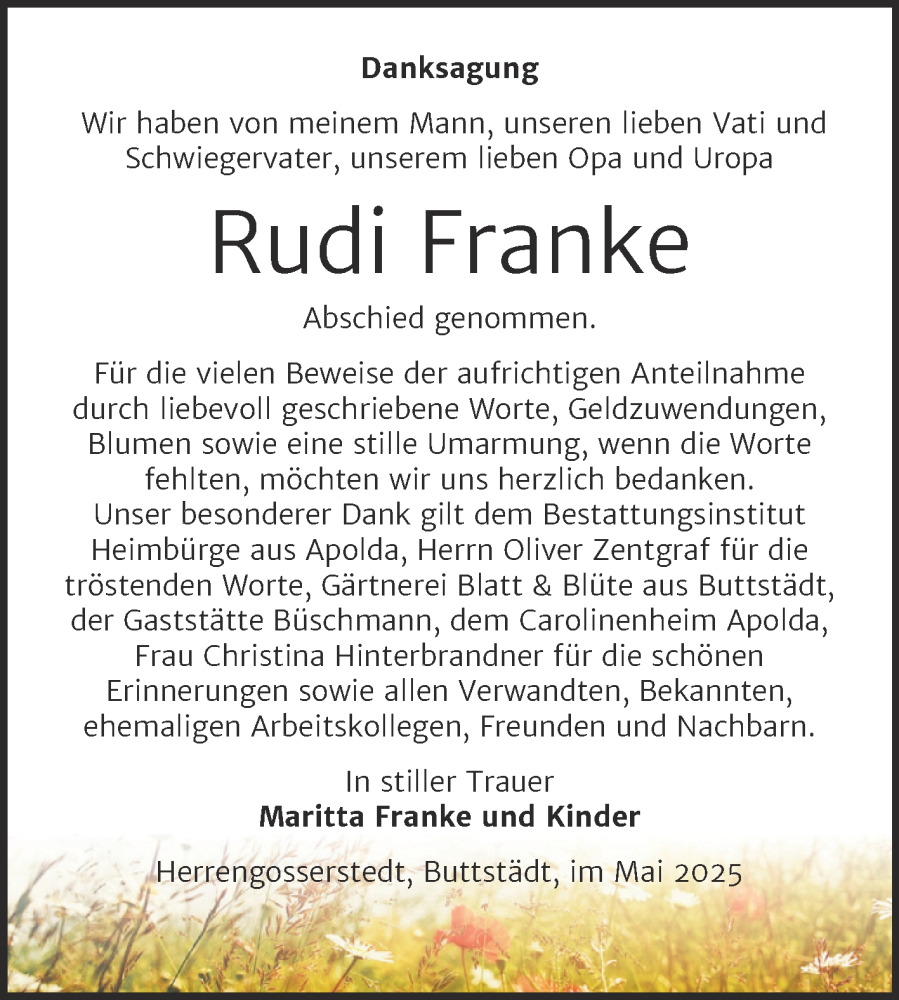 Hier finden Sie alle Traueranzeigen aus der Zeitung, die bisher für Rudi Franke erschienen sind. Weitere Traueranzeigen, die in der Zeitung erscheinen, werden hier ebenfalls aufgelistet