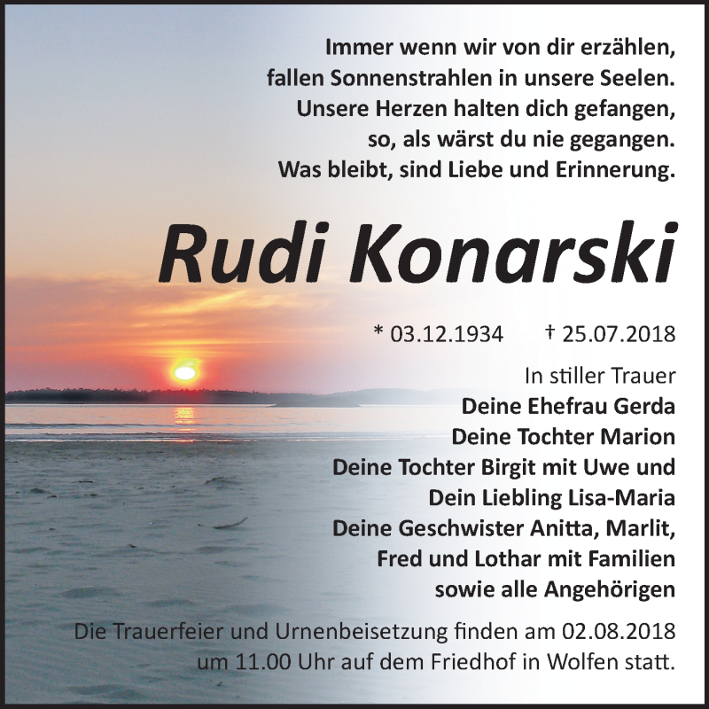 Hier finden Sie alle Traueranzeigen aus der Zeitung, die bisher für Rudi Konarski erschienen sind. Weitere Traueranzeigen, die in der Zeitung erscheinen, werden hier ebenfalls aufgelistet