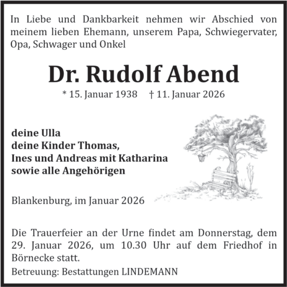 Hier finden Sie alle Traueranzeigen aus der Zeitung, die bisher für Rudolf Abend erschienen sind. Weitere Traueranzeigen, die in der Zeitung erscheinen, werden hier ebenfalls aufgelistet