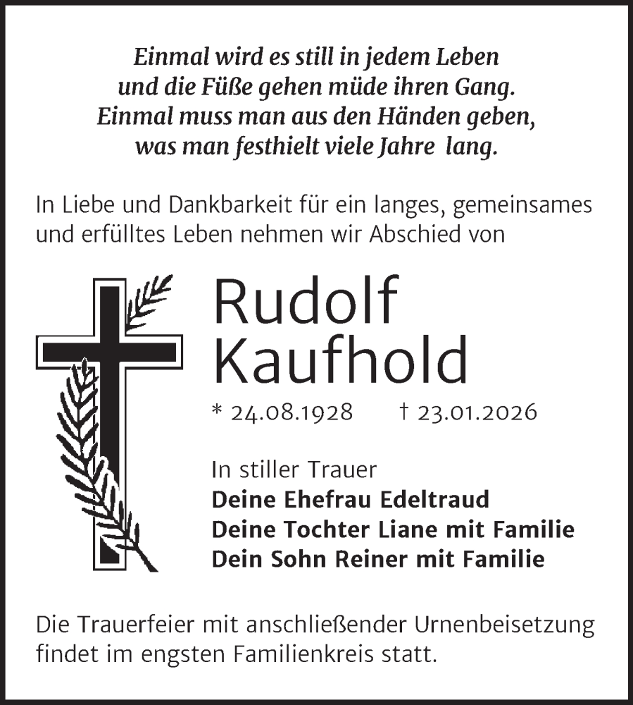 Hier finden Sie alle Traueranzeigen aus der Zeitung, die bisher für Rudolf Kaufhold erschienen sind. Weitere Traueranzeigen, die in der Zeitung erscheinen, werden hier ebenfalls aufgelistet