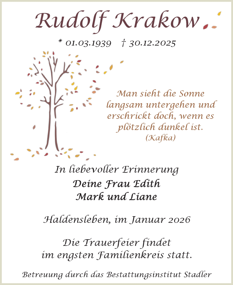Hier finden Sie alle Traueranzeigen aus der Zeitung, die bisher für Rudolf Krakow erschienen sind. Weitere Traueranzeigen, die in der Zeitung erscheinen, werden hier ebenfalls aufgelistet