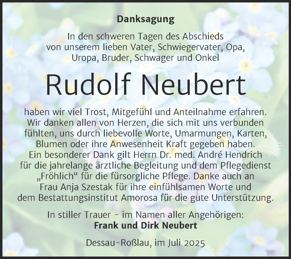 Hier finden Sie alle Traueranzeigen aus der Zeitung, die bisher für Rudolf Neubert erschienen sind. Weitere Traueranzeigen, die in der Zeitung erscheinen, werden hier ebenfalls aufgelistet