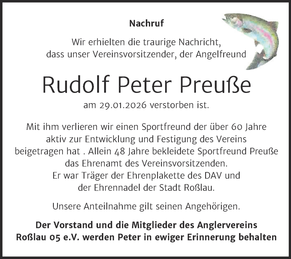 Hier finden Sie alle Traueranzeigen aus der Zeitung, die bisher für Rudolf Peter Preuße erschienen sind. Weitere Traueranzeigen, die in der Zeitung erscheinen, werden hier ebenfalls aufgelistet
