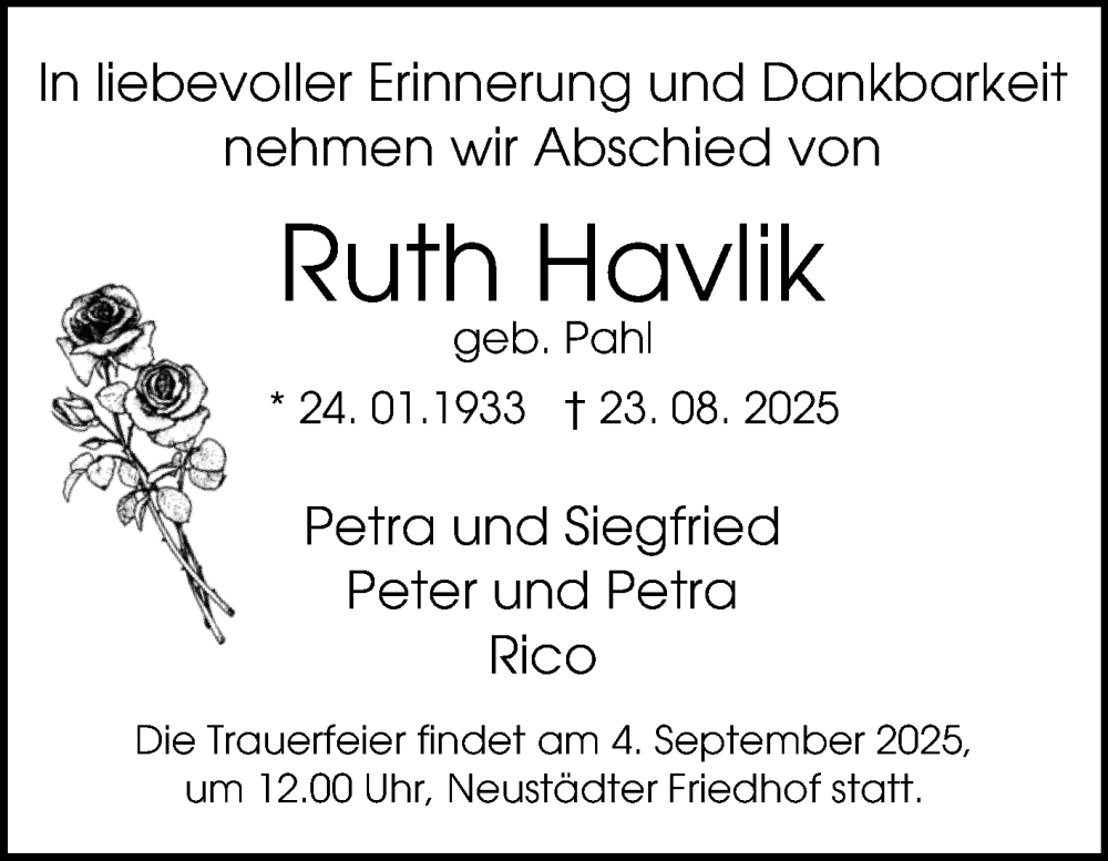 Hier finden Sie alle Traueranzeigen aus der Zeitung, die bisher für Ruth Havlik erschienen sind. Weitere Traueranzeigen, die in der Zeitung erscheinen, werden hier ebenfalls aufgelistet