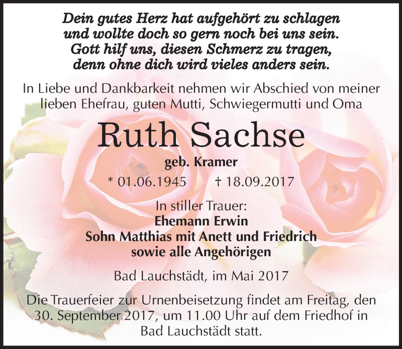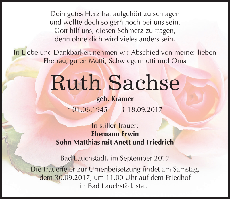 Hier finden Sie alle Traueranzeigen aus der Zeitung, die bisher für Ruth Sachse erschienen sind. Weitere Traueranzeigen, die in der Zeitung erscheinen, werden hier ebenfalls aufgelistet
