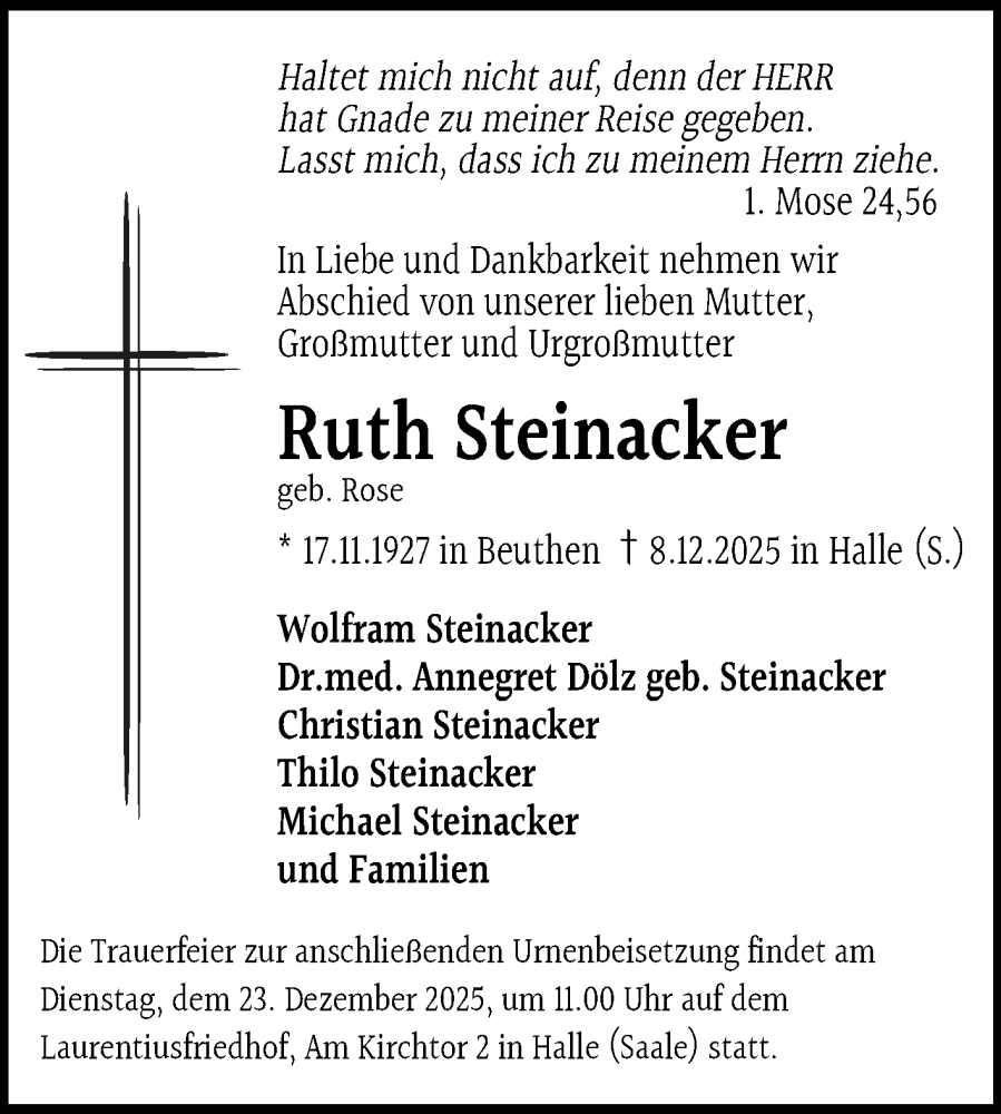 Hier finden Sie alle Traueranzeigen aus der Zeitung, die bisher für Ruth Steinacker erschienen sind. Weitere Traueranzeigen, die in der Zeitung erscheinen, werden hier ebenfalls aufgelistet