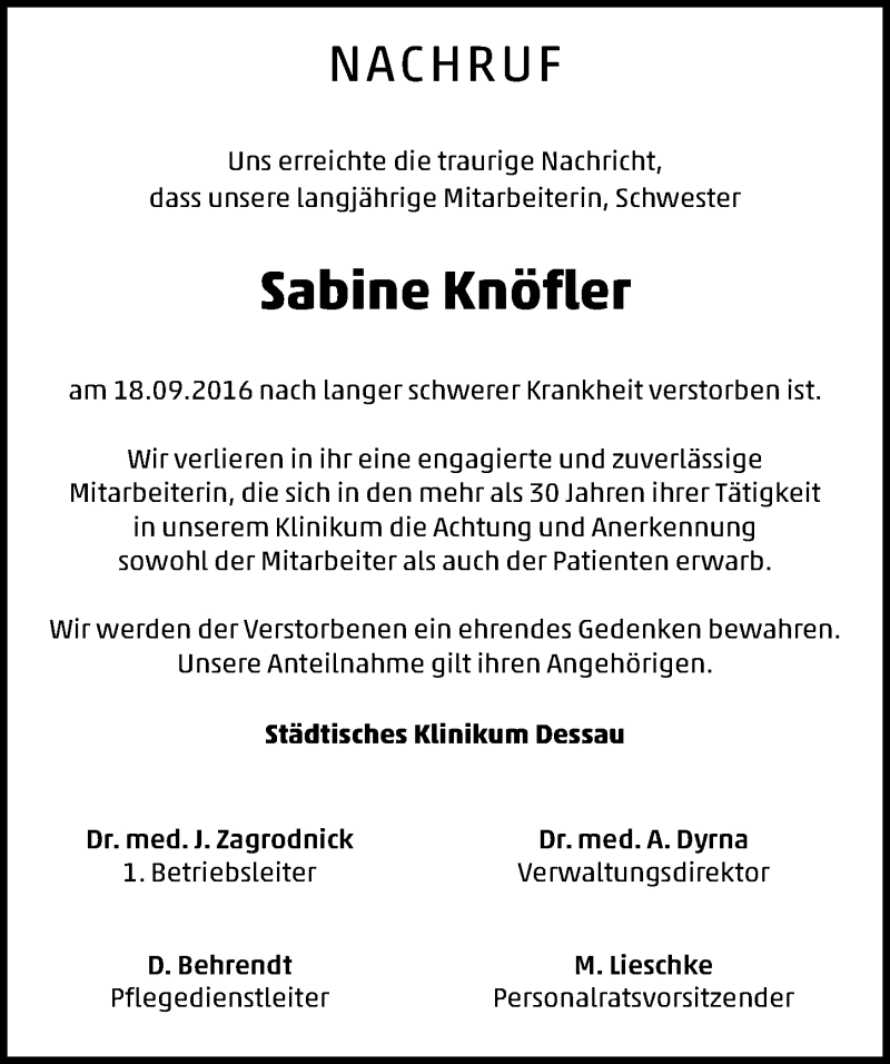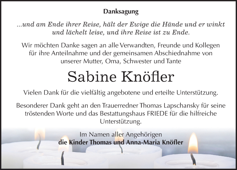 Hier finden Sie alle Traueranzeigen aus der Zeitung, die bisher für Sabine Knöfler erschienen sind. Weitere Traueranzeigen, die in der Zeitung erscheinen, werden hier ebenfalls aufgelistet