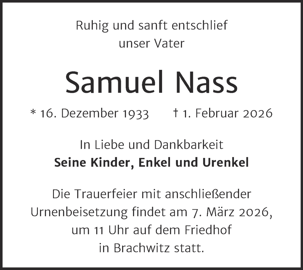 Hier finden Sie alle Traueranzeigen aus der Zeitung, die bisher für Samuel Nass erschienen sind. Weitere Traueranzeigen, die in der Zeitung erscheinen, werden hier ebenfalls aufgelistet