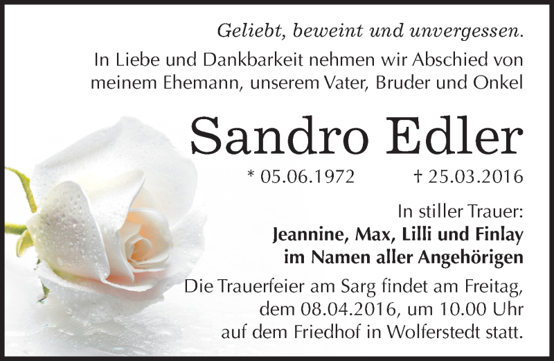 Hier finden Sie alle Traueranzeigen aus der Zeitung, die bisher für Sandro Edler erschienen sind. Weitere Traueranzeigen, die in der Zeitung erscheinen, werden hier ebenfalls aufgelistet
