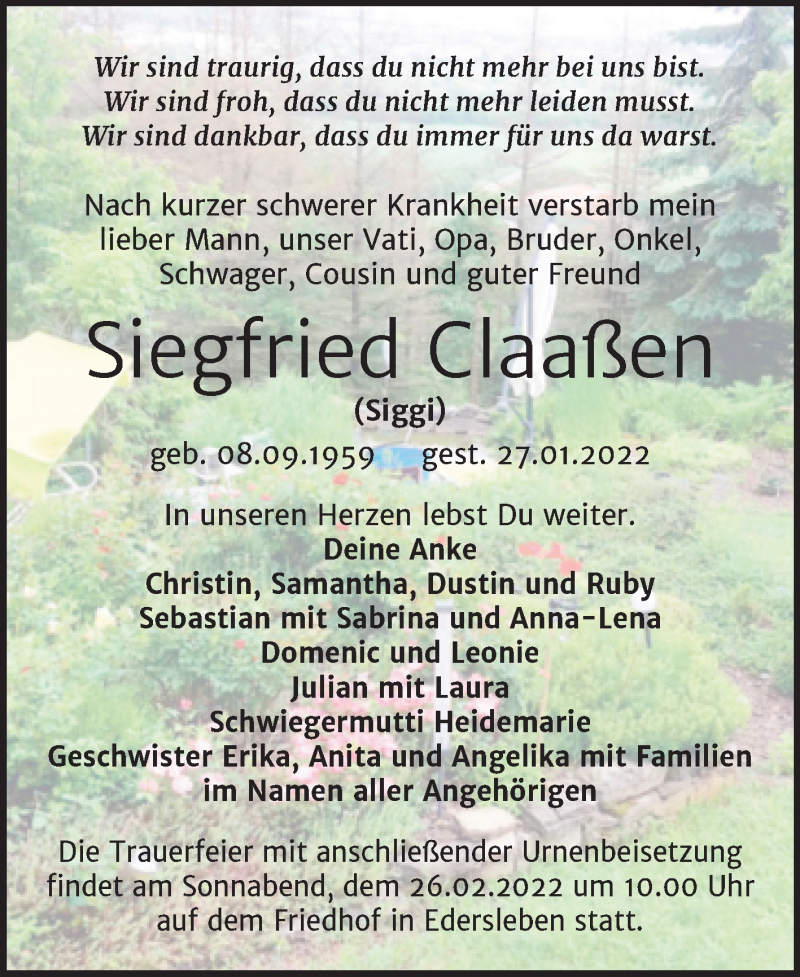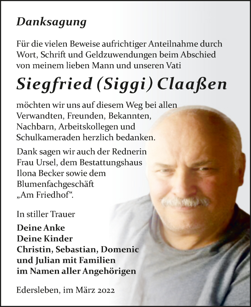 Hier finden Sie alle Traueranzeigen aus der Zeitung, die bisher für Siegfried Claaßen erschienen sind. Weitere Traueranzeigen, die in der Zeitung erscheinen, werden hier ebenfalls aufgelistet