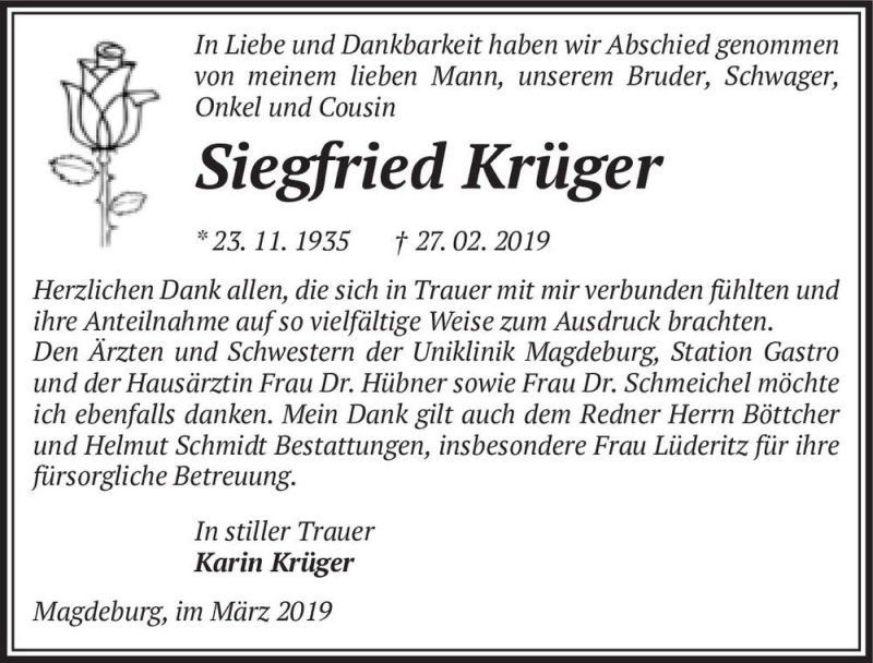 Hier finden Sie alle Traueranzeigen aus der Zeitung, die bisher für Siegfried Krüger erschienen sind. Weitere Traueranzeigen, die in der Zeitung erscheinen, werden hier ebenfalls aufgelistet