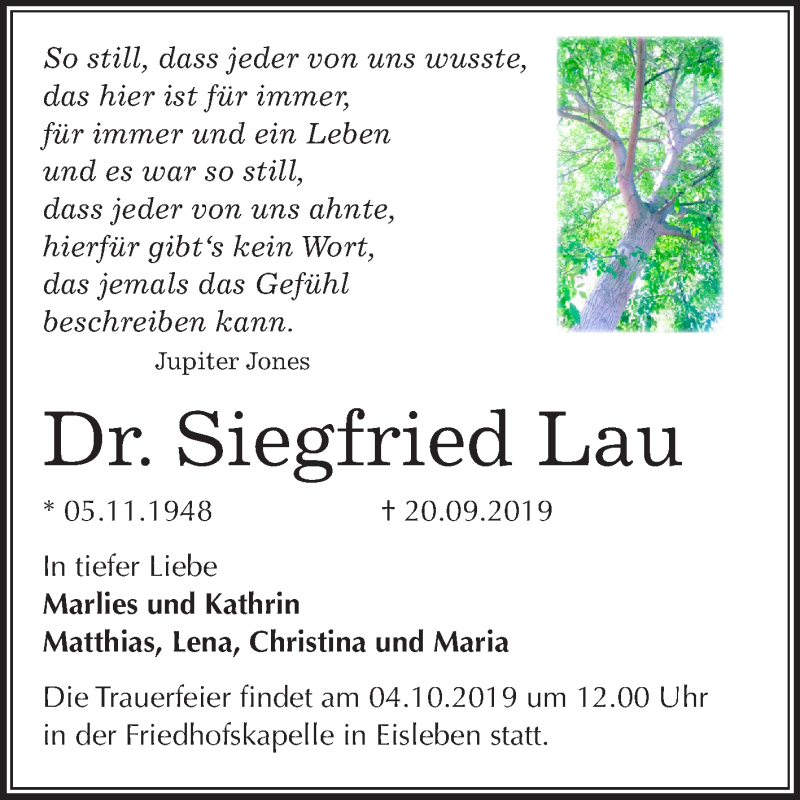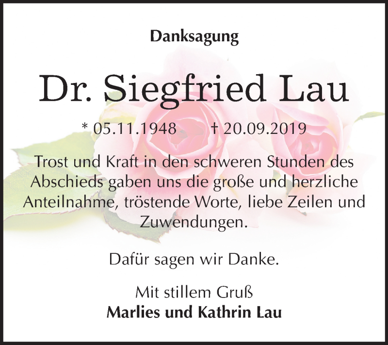 Hier finden Sie alle Traueranzeigen aus der Zeitung, die bisher für Siegfried Lau erschienen sind. Weitere Traueranzeigen, die in der Zeitung erscheinen, werden hier ebenfalls aufgelistet