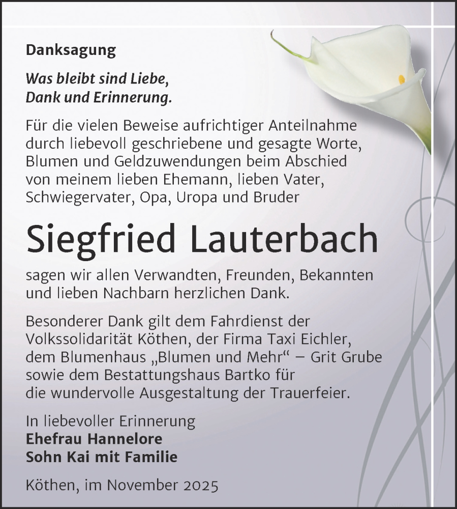 Hier finden Sie alle Traueranzeigen aus der Zeitung, die bisher für Siegfried Lauterbach erschienen sind. Weitere Traueranzeigen, die in der Zeitung erscheinen, werden hier ebenfalls aufgelistet