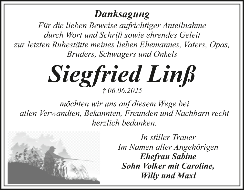Hier finden Sie alle Traueranzeigen aus der Zeitung, die bisher für Siegfried Linß erschienen sind. Weitere Traueranzeigen, die in der Zeitung erscheinen, werden hier ebenfalls aufgelistet