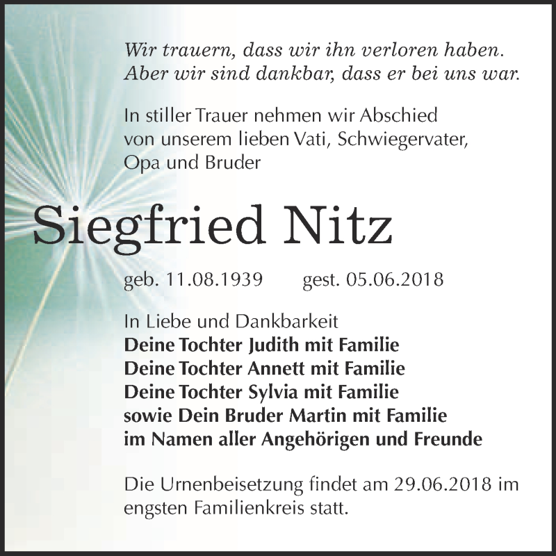 Hier finden Sie alle Traueranzeigen aus der Zeitung, die bisher für Siegfried Nitz erschienen sind. Weitere Traueranzeigen, die in der Zeitung erscheinen, werden hier ebenfalls aufgelistet