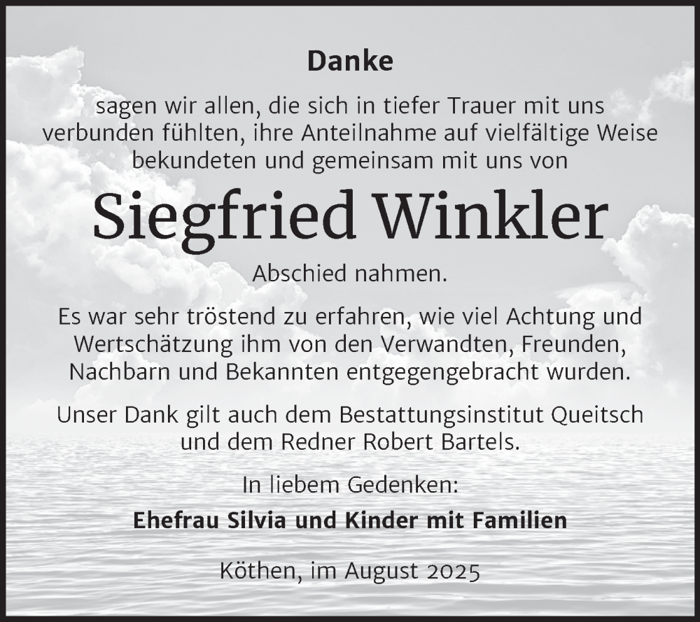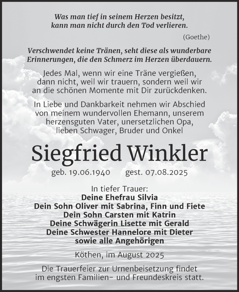 Hier finden Sie alle Traueranzeigen aus der Zeitung, die bisher für Siegfried Winkler erschienen sind. Weitere Traueranzeigen, die in der Zeitung erscheinen, werden hier ebenfalls aufgelistet