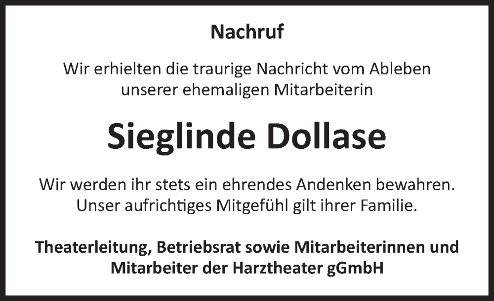 Hier finden Sie alle Traueranzeigen aus der Zeitung, die bisher für Sieglinde Dollase erschienen sind. Weitere Traueranzeigen, die in der Zeitung erscheinen, werden hier ebenfalls aufgelistet