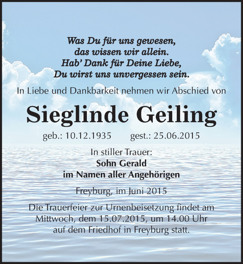 Hier finden Sie alle Traueranzeigen aus der Zeitung, die bisher für Sieglinde Geiling erschienen sind. Weitere Traueranzeigen, die in der Zeitung erscheinen, werden hier ebenfalls aufgelistet