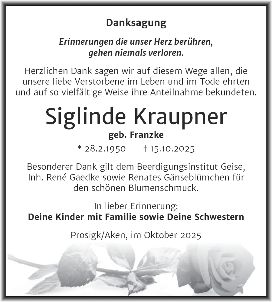 Hier finden Sie alle Traueranzeigen aus der Zeitung, die bisher für Siglinde Kraupner erschienen sind. Weitere Traueranzeigen, die in der Zeitung erscheinen, werden hier ebenfalls aufgelistet